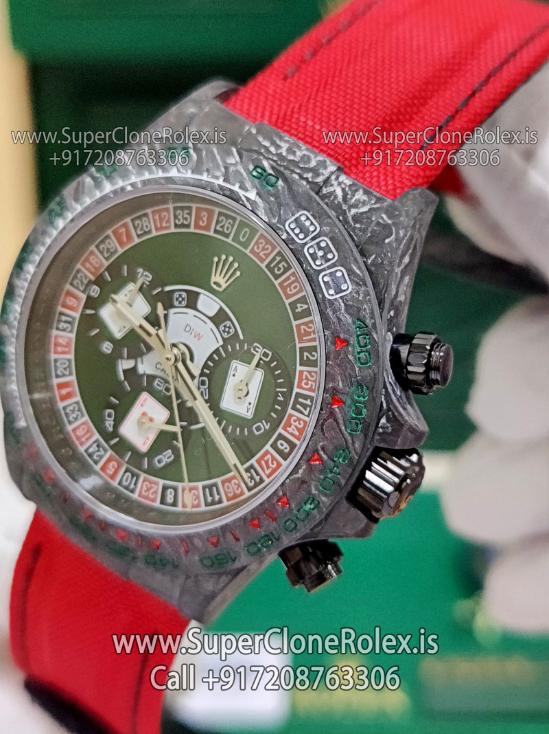 | Please Note: This is a Custom Made Rolex Daytona Super Clone made of Real forged Carbon Fiber. The use of Carbon case makes this watch the lightest Daytona ever produced | |